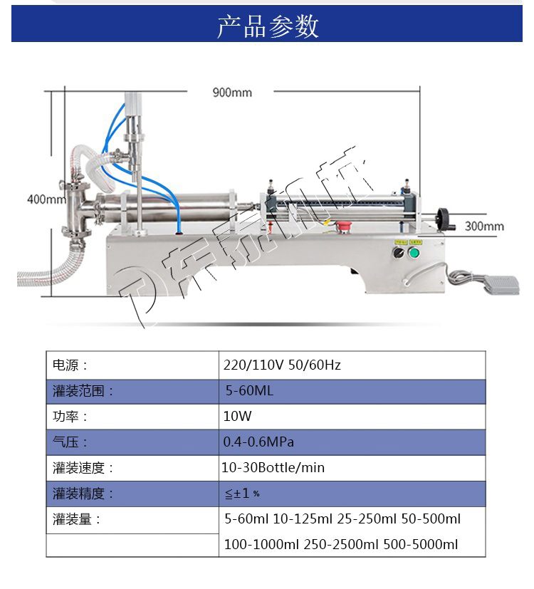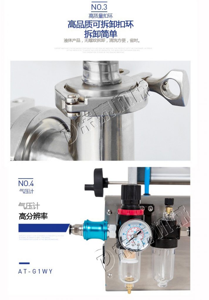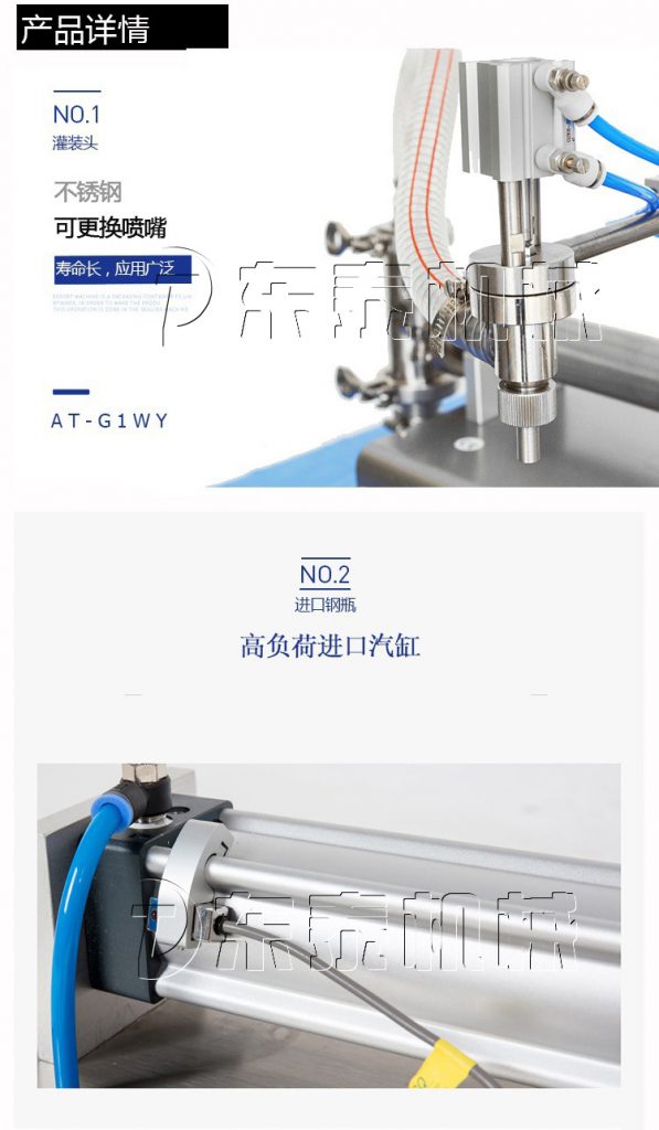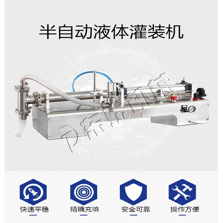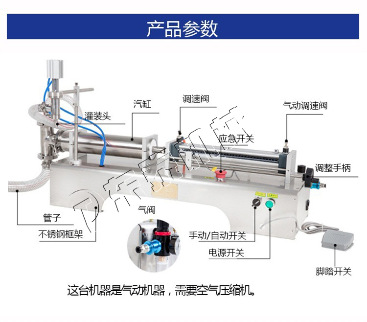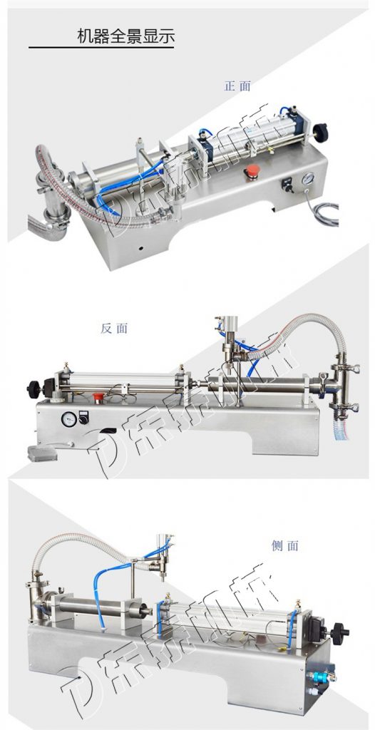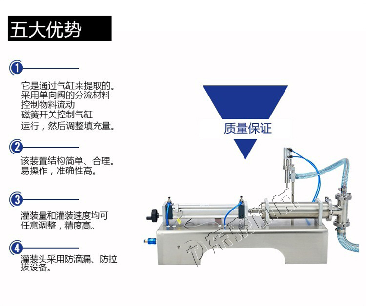 小型液體定量灌裝機,通過氣缸帶動一個活塞來抽取和打出物料,用單項閥控制物料流向,小型液體定量灌裝機用磁簧開關控制氣缸的行程,即可調節(jié)灌裝量。