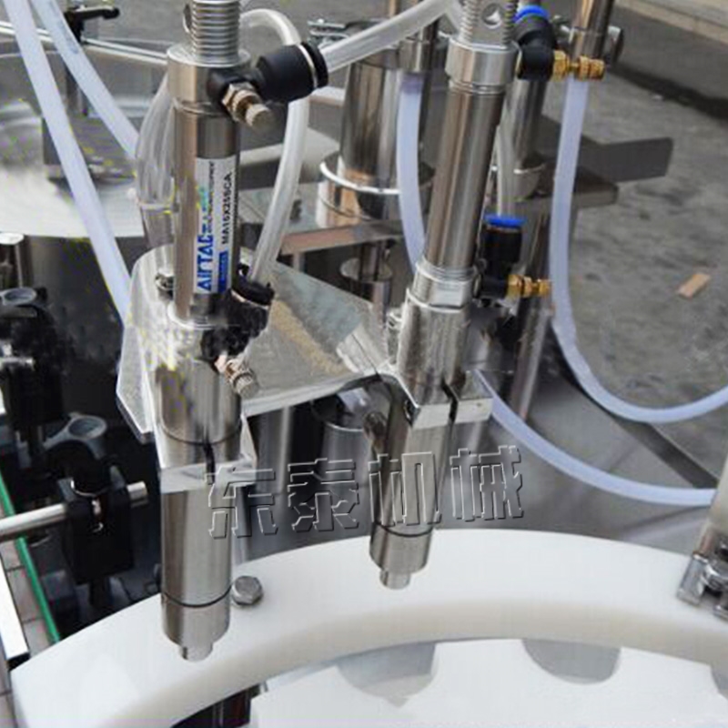 3、小瓶藥液灌裝旋蓋機灌裝系統(tǒng)具有吸氣功能,可防止液滴飛
